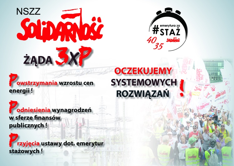 Na posiedzeniu Komisji Krajowej NSZZ „S” w dniach 22–23 września br. w Zakopanem przyjęto stanowisko, w którym wskazano trzy najważniejsze problemy, przed jakimi stoją polscy pracownicy. Są to: systemowe powstrzymanie wzrostu cen energii uzyskiwanej ze wszystkich rodzajów surowców i nośników, zapewnienie godziwego (systemowego) wzrostu wynagrodzeń pracowników w szeroko rozumianej sferze finansów publicznych oraz przyjęcie ustawy dotyczącej tzw. emerytur stażowych.