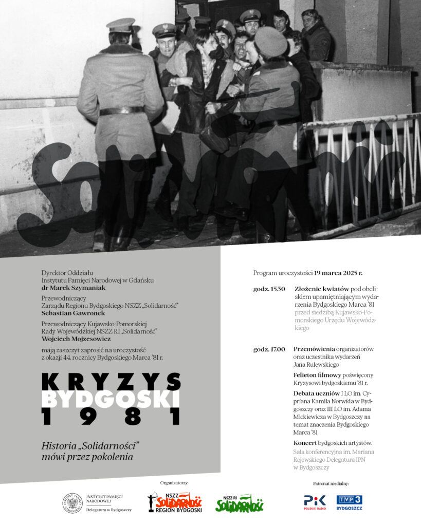 Dyrektor Oddziału Instytutu Pamięci Narodowej w Gdańsku dr Marek Szymaniak, przewodniczący Zarządu Regionu Bydgoskiego NSZZ „Solidarność” Sebastian Gawronek oraz przewodniczący Kujawsko-Pomorskiej Rady Wojewódzkiej Rolników Indywidualnych NSZZ „Solidarność” Wojciech Mojzesowicz zapraszają na uroczystość z okazji 44. rocznicy Bydgoskiego Marca 1981 r.