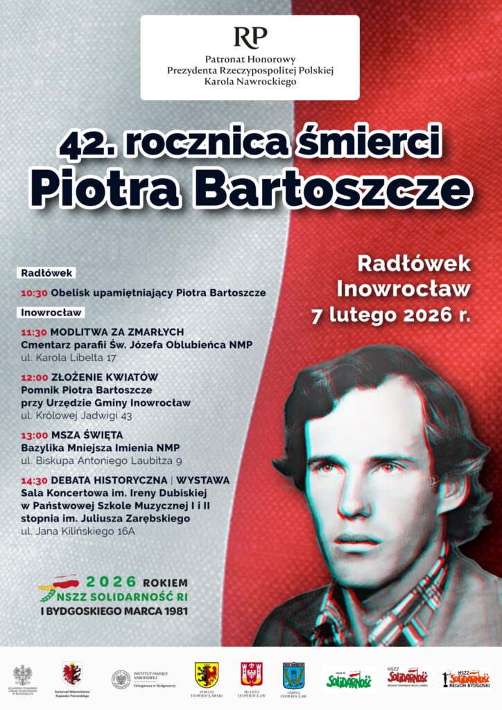 Zapraszamy do udziału w obchodach 42. rocznicy śmierci Piotra Bartoszcze – działacza opozycji antykomunistycznej, jednego z liderów rolniczej „Solidarności”. Jego ciało odnaleziono 7 lutego 1984 r. w studzience melioracyjnej przy drodze koło Inowrocławia. Miał liczne obrażenia wskazujące na brutalne pobicie.